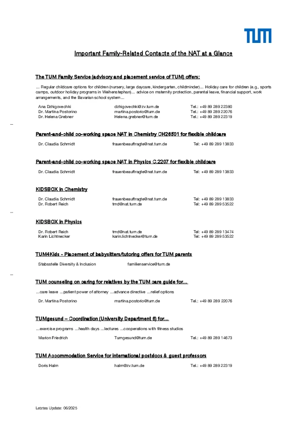 In such situations, TUM offers advice and, if necessary, emergency care. Further information on this, various brochures on the subject of care and information on flexible working hours to enable you to be active in caring for relatives can be found on the TUM Family Service pages.