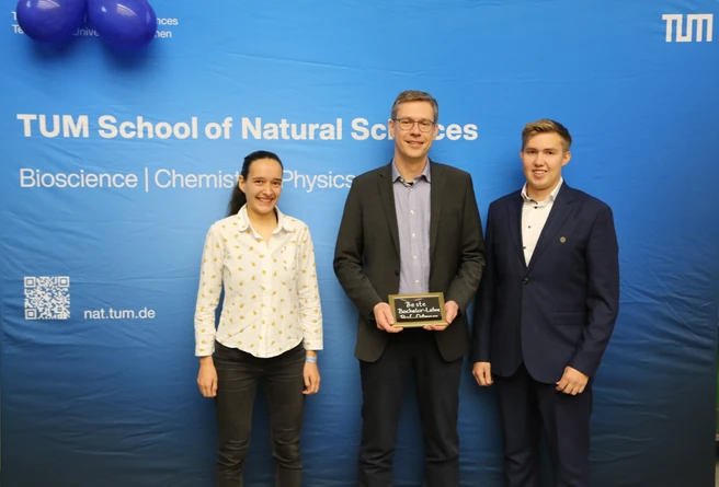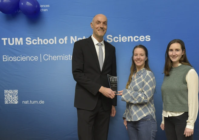 Prof. Stephan Sieber (links) erhielt den Supervisory Award, überreicht von den Doctoral Representatives Melanie Hoffmann (Mitte) und Paula Neumann (rechts). Bild: Dr. Annemieke IJpenberg / TUM