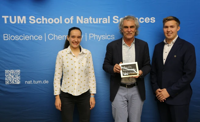 Prof. Frank Ortmann (Mitte) wurde von der Fachschaft MPIC (vertreten von Marina Ruoff, links & Jannik Husemann, rechts) für seine Vorlesung „Quantenmechanik“ im Bachelor ausgezeichnet. Bild: Martin Schellerer / TUM