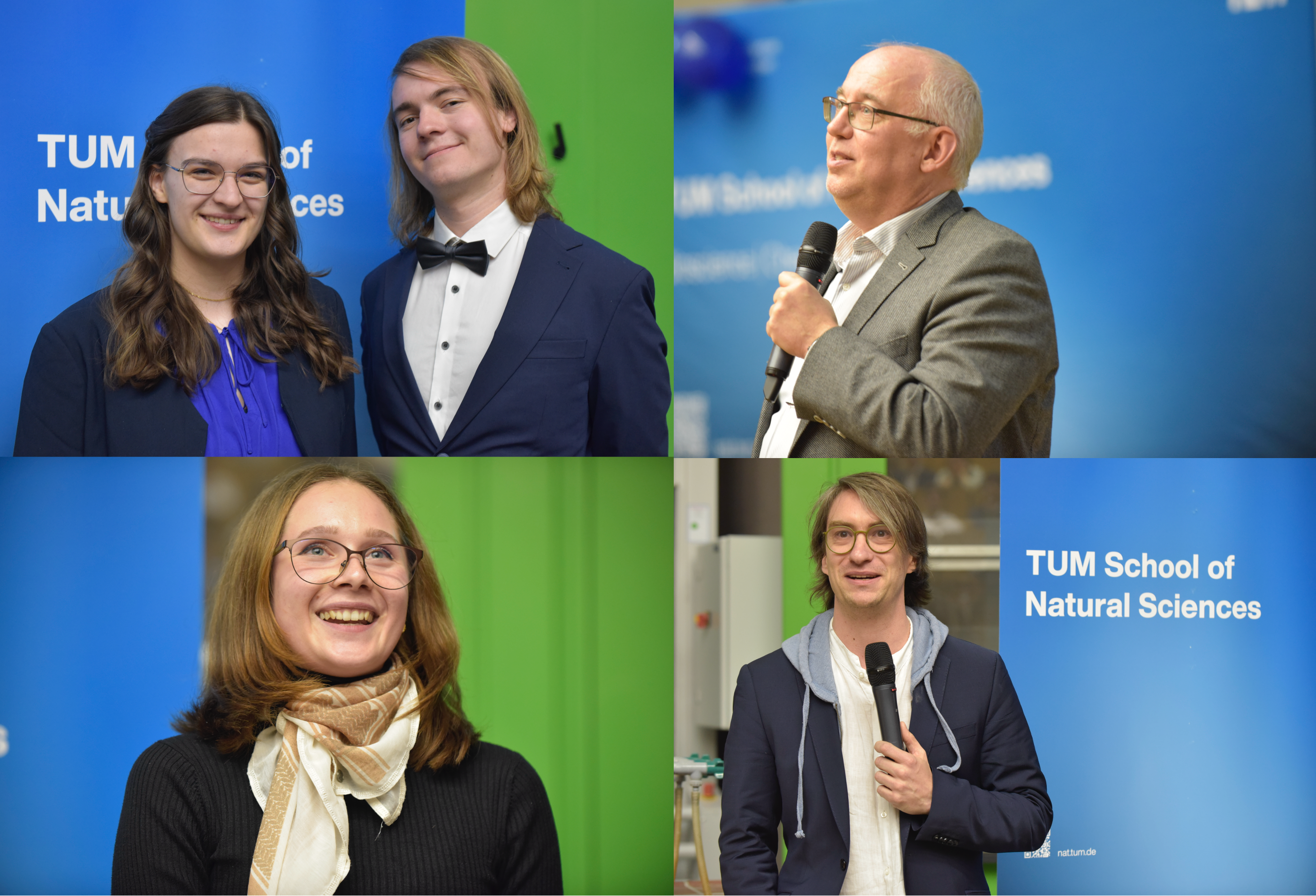 Zusammenstellung einiger Bilder der Feier. Moderatoren Veronika Hobmeier und Ole Fleischhauer (oben links), Department Head der Chemie Prof. Tom Nilges (oben rechts), Absolventin der Biochemie Sofia Ostrovskyj bei Ihrer Rede (unten links) und Prof. Helge Stein während seines wissenschaftlichen Vortrags (unten rechts). Bilder: Dr. Annemieke IJpenberg / TUM