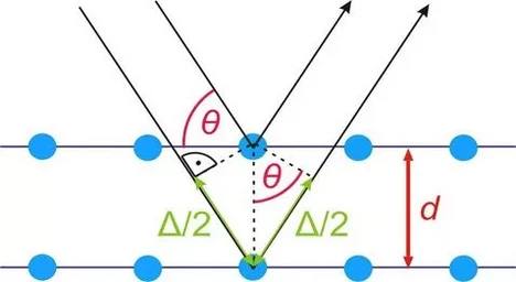 Als Röntgenstrahlung bezeichnet man elektromagnetische Strahlung, die aus hochenergetischen Prozessen mit Elektronen generiert wurde. Die Wellenlängen dieser Strahlung reichen von ca. 1 pm bis 250 pm und liegen im gleichen Bereich wie typische interatomare Abstände bzw. Bindungslängen im Festkörper. Die elektromagnetische Röntgenstrahlung kann mit den Elektronen eines Atoms wechselwirken, beispielsweise wird durch elastische Streuung an einem Atom eine kugelförmige Streuwelle erzeugt. Daher können kristalline Stoffe, also aus regelmäßigen Anordnungen von Atomen oder Molekülen bestehende Festkörper, als optische Gitter für Röntgenstrahlung fungieren. Dank der Interferenz der an verschiedenen Streuzentren gestreuten Strahlung kann man die resultierende Strahlung mathematisch als Spiegelung an Ebenen von Atomen, sogenannten Netzebenen, behandeln. Die Intensitätsmaxima der gestreuten („gebeugten“) Strahlung bezeichnet man als Reflexe. Der Zusammenhang zwischen der einfallenden Röntgenwellenlänge l, dem kürzesten Abstand zwischen parallelen Netzebenen d und dem beobachteten Beugungswinkel θ eines Reflexes wird durch die „Bragg‘sche Gleichung“ beschrieben: